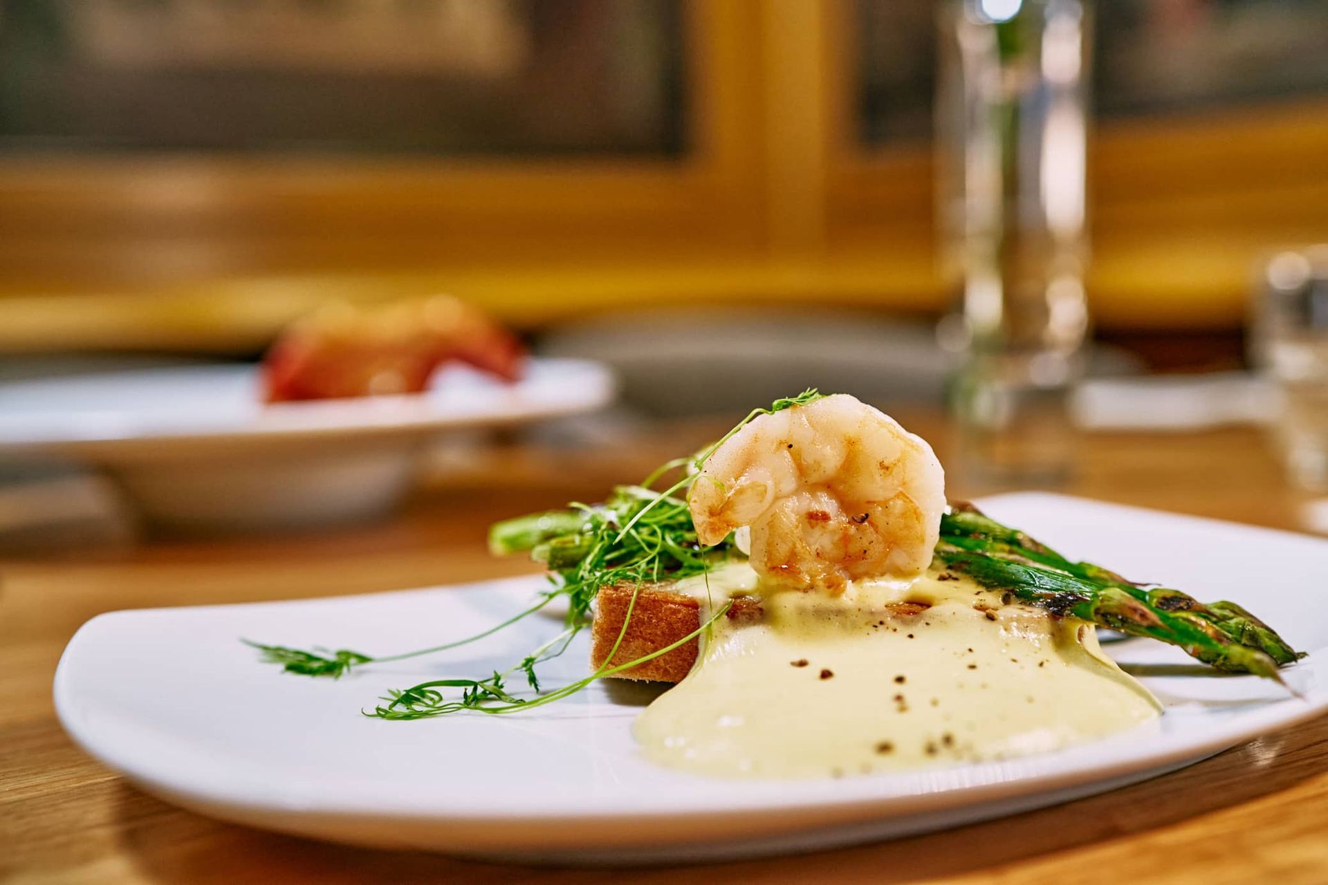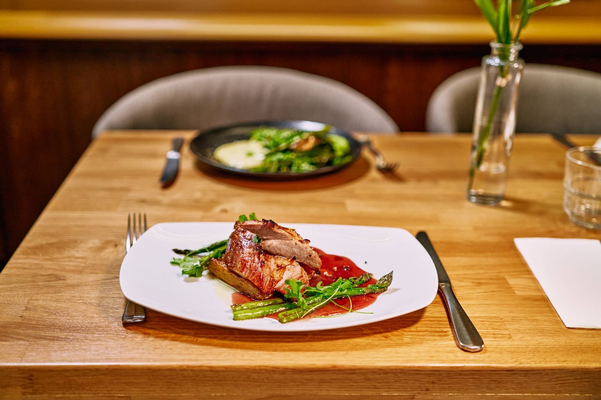 Duck leg & asparagus puree with red wine sauce and pickled asparagus