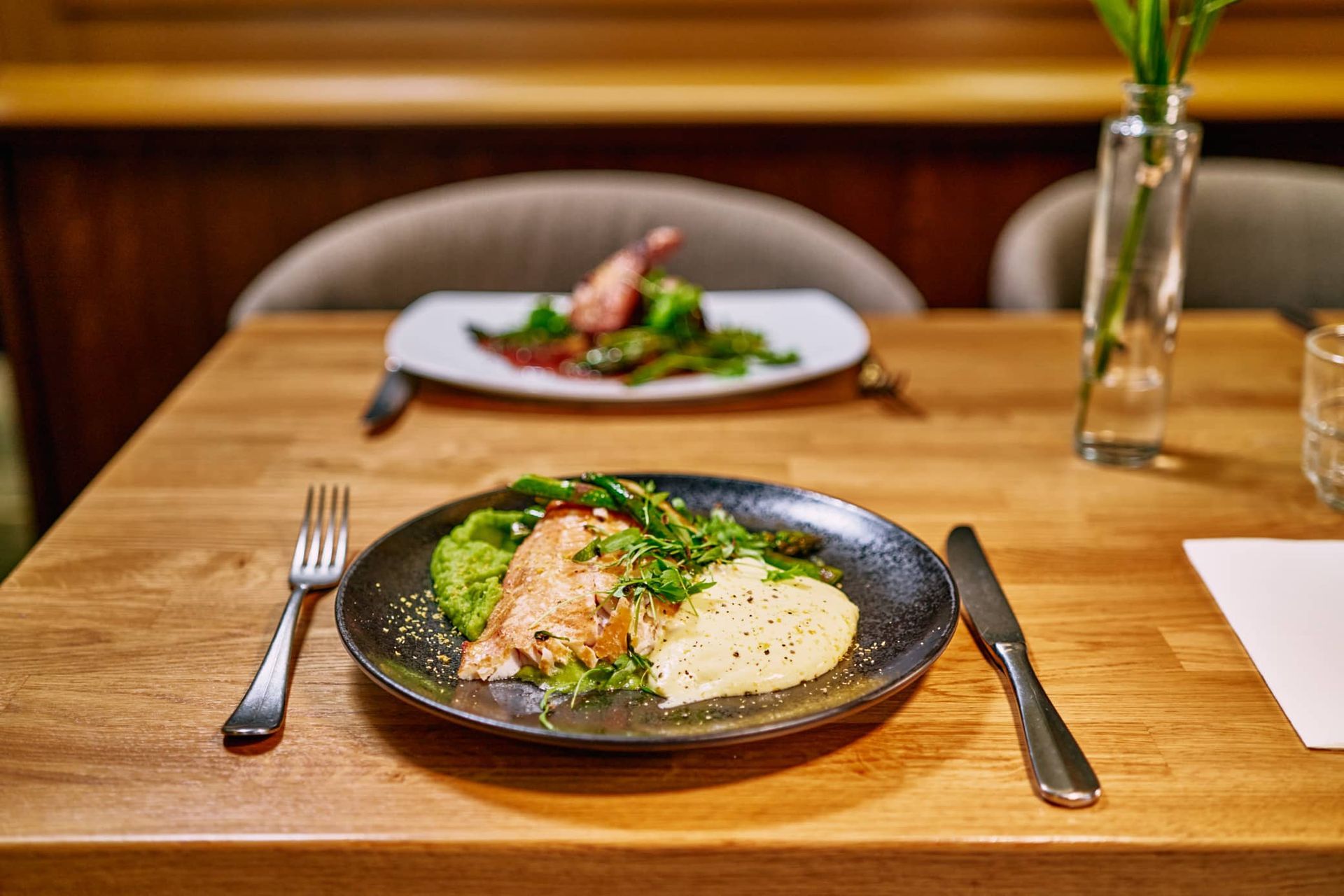 Paistettuja osterivinokkaita & parsapyreetä karamellisoitua purjoa ja pikkelöityä kurkkua