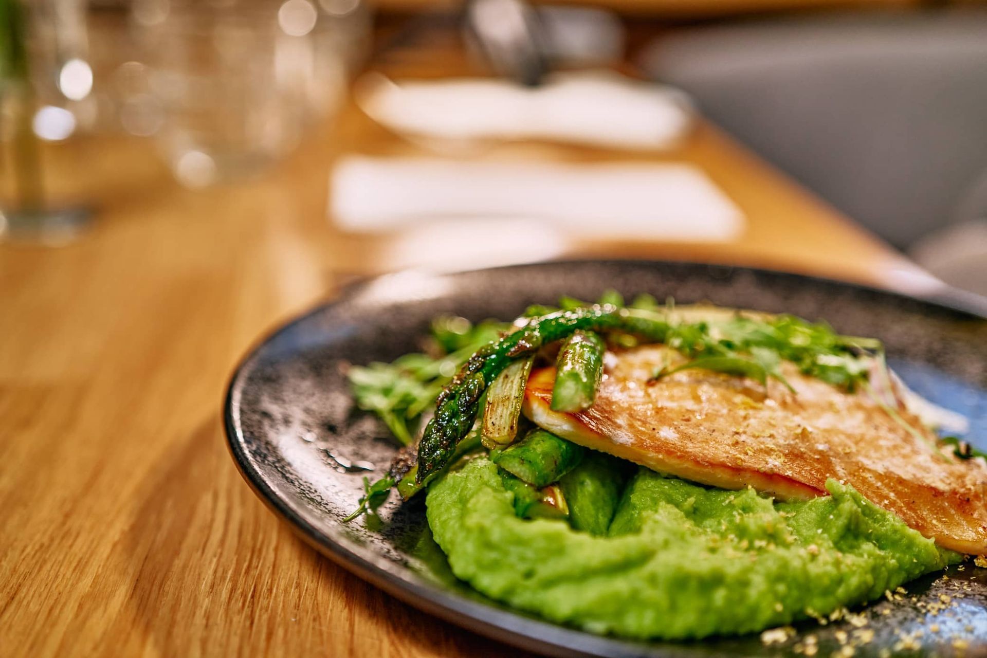 Fried oyster mushrooms & asparagus puree with caramelized leeks and pickled cucumber